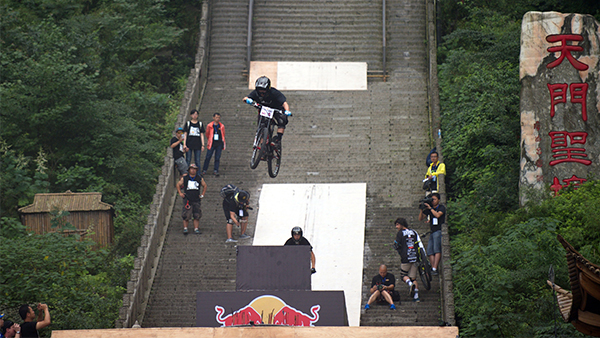 “紅牛天梯速降賽”競速賽明天將如期舉辦,選手們將在999級天梯、斜坡平均40度天門山天梯上俯沖騎行,在“香爐”處騰空飛躍跨度超過6.5米、高差超過5米的跳臺完成比賽。