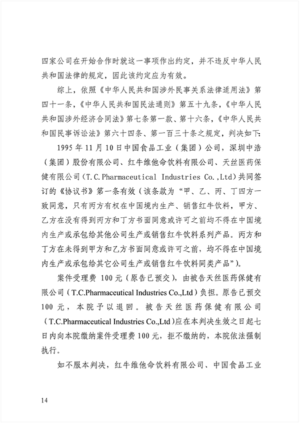 “依照《中華人民共和國涉外民事關系法律適用法》第四十一條,《中華人民共和國民法通則》第五十九條,《中華人民共和國涉外經濟合同法》第七條第一款、第十六條,《中華人民共和國民事訴訟法》第六十四條、第一百三十條之規定,判決如下:1995 年 11 月 10 日中國食品工業(集團)公司、深圳中浩(集團)股份有限公司、紅牛維他命飲料有限公司、天絲醫藥保健有限公司共同簽訂的《協議書》第一條有效(該條款為“甲、乙、丙、丁四方一致同意,只有丙方有權在中國境內生產、銷售紅牛飲料,甲方、乙方在沒有得到丙方和丁方書面同意或許可之前均不得在中國境內生產或承包給其他公司生產或銷售紅牛飲料系列產品。丙方和丁方在未得到甲方和乙方書面同意或許可之前,均不得在中國境內生產或承包給其它公司生產或銷售紅牛飲料同類產品”)。