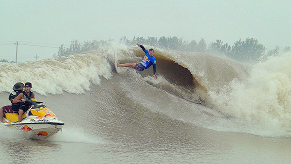相比于澳大利亞昆士蘭隊,后手上浪的美國夏威夷隊顯然準備得更為充分,有過四次錢塘江沖浪經驗的斯特林載著隊友嫻熟地駕駛著摩托艇,很快,熟悉錢塘潮水性的他便發現了一處白浪滔天的絕佳上潮點,大浪專家奧布萊恩見勢毫不猶豫,棄艇登板,直面這股超過4.5米的巨浪,“今天的浪很強勁,在斯特林的帶領下,我們找到一個足有浪高足有15英尺(4.5米)的大浪,它直接拍在我身上,沖浪板也被沖擊的有些晃,我幾乎被水全部包裹。好在我及時調整了重心,用盡全力做了一個垂直表演(Vertical)沖到浪頭,借著浪的力道,我感覺一下子從水底鉆了出來,視野豁然開朗,我聽到旁邊艇上的評委都在喝彩,我興奮地借著浪的走勢勢左右滑行,那一刻的感覺,真的感覺棒極了。”