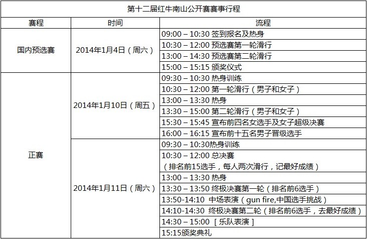第12屆紅牛南山公開賽將于2014年1月11日-12日在北京密云南山滑雪場舉辦,總獎金將從6萬美元升至7.5萬美元,比賽規模進一步擴大,共有30名國際頂尖單板滑手和8名中國滑手入圍正賽,其中女子組參賽人數將增加至12人。與索契冬奧會相比,紅牛南山公開賽的賽道設計更加緊湊,跳臺和道具之間用于滑行加速的距離更短,其中前兩個跳臺的難度最大、分值比例也最高,對選手動作的穩定性和流暢性要求極高。