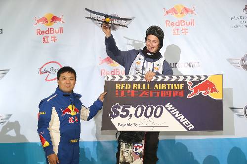中國紅牛特技飛行隊隊長趙偉為“紅牛飛行時間”冠軍斯溫·索格倫頒獎
